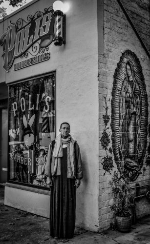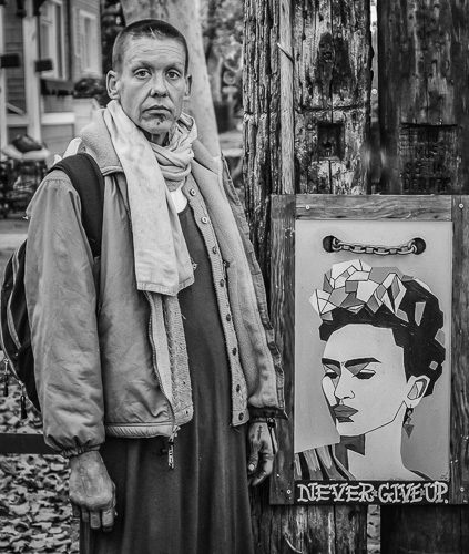 Melanie and I chat for awhile. I take Melanie’s photos under the Madonna on the side Poli’s barber shop and the Frida that is on a telephone pole in front of the shop. I also give Melanie some money for coffee. Hopefully, we will see one another again.