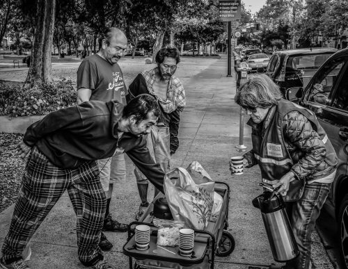 Over a period of a couple of months Katy has established a presence in the park. She is no longer a stranger to the park’s homeless. She knows those homeless who stay in the park and greets many by name. Sacramento poIice who patrol the park also know who Katy is and they too are offered a cup of coffee.