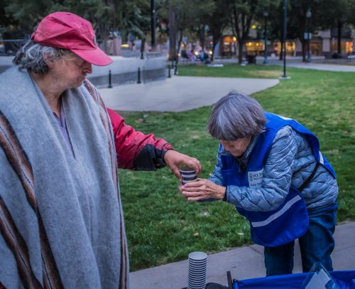 Katy is a Friday morning presence in Cesar Chavez park, sharing a cup of coffee and conversation with the homeless. Katy is the Mercy Pedaler who pulls the wagon.