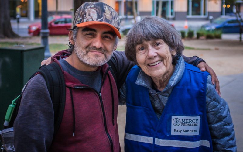 Not all Mercy Pedalers pedal. On Friday mornings you will find Mercy Pedaler Katy Sanders pulling her wagon around Cesar Chavez park in downtown Sacramento, across the street from City Hall. The park is a small square block area where many homeless sleep the night.