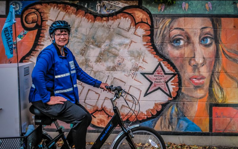 As Sister Libby often puts it, “I found being present in the moment, sharing a cup of coffee together, and calling the person by name are the most important gifts one can offer to the homeless.” The following article about Sister Libby and Sacramento’s Mercy Pedalers appears in the Fall 2017 issue of Living Mercy. Click Mercy Pedalers offer coffee and compassion below to read the article.