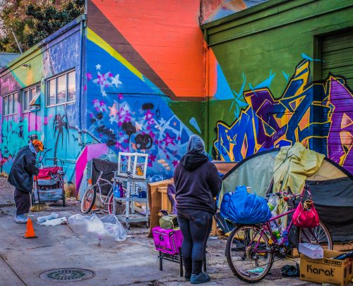I met Ebo a few weeks back on one of my Mercy Pedaler “dawn patrols” in Midtown. Ebo is homeless, but he lives in a world of street art. He resides in what can only be described as alley housing, i.e., behind a commercial building next to a K Street garage covered inside and out with street murals. His quarters consist of a tent, some tarps, miscellaneous junk that has been collected from around the neighborhood, and a “patio” that serves as a work area where he putters around repairing bicycles.